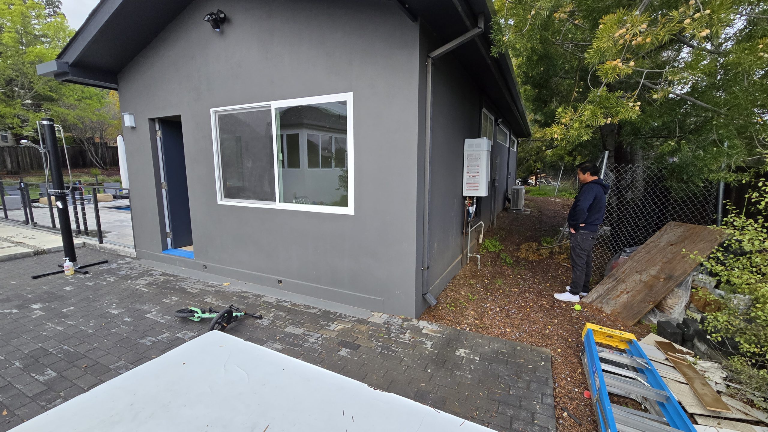 Exterior of Pool House with Scooter and Outdoor Shower