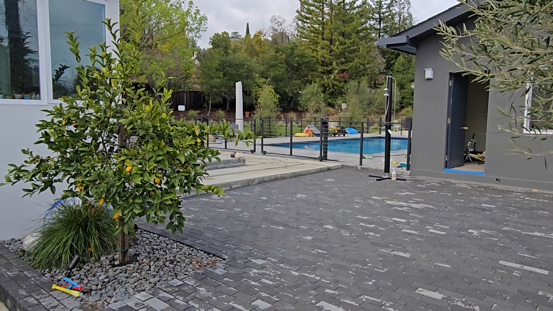 Outdoor Area with Young Citrus Tree and Pool Fence