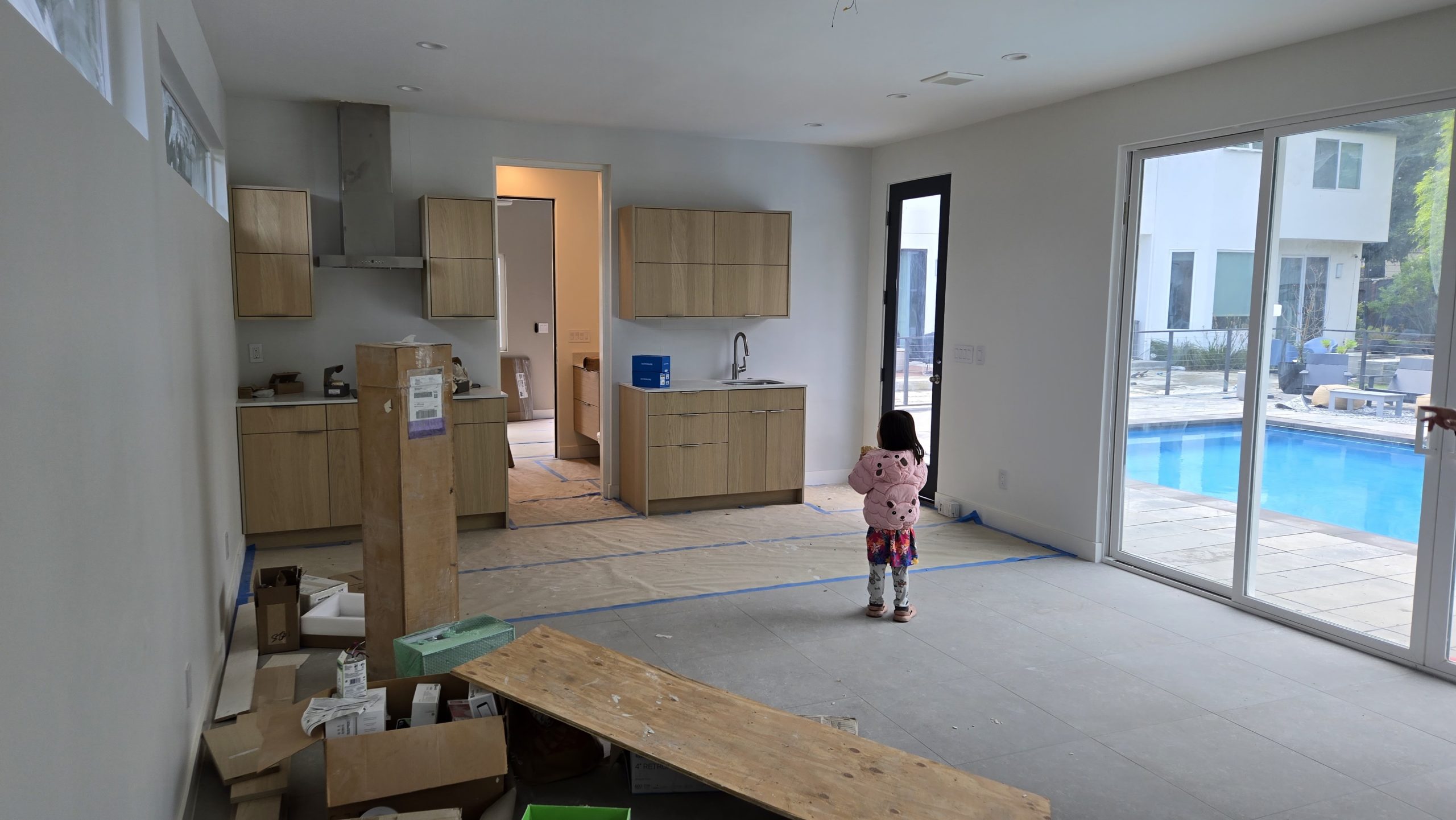 Kitchen Area and Pool View with Child in Room