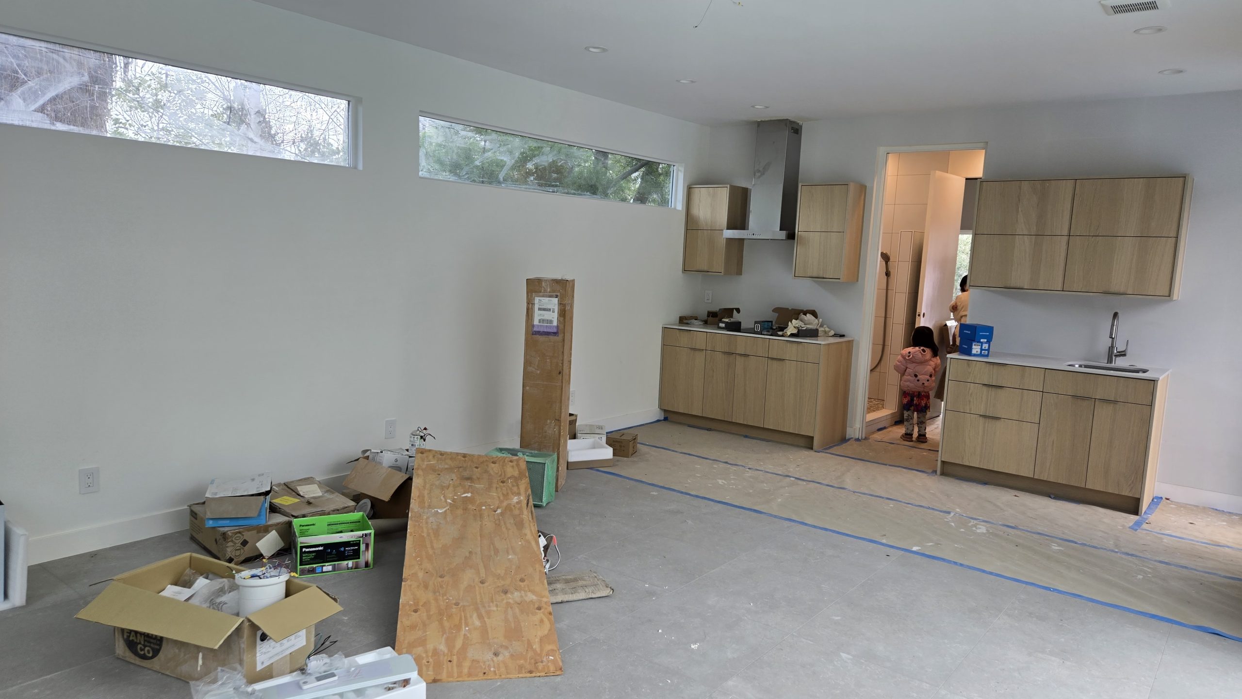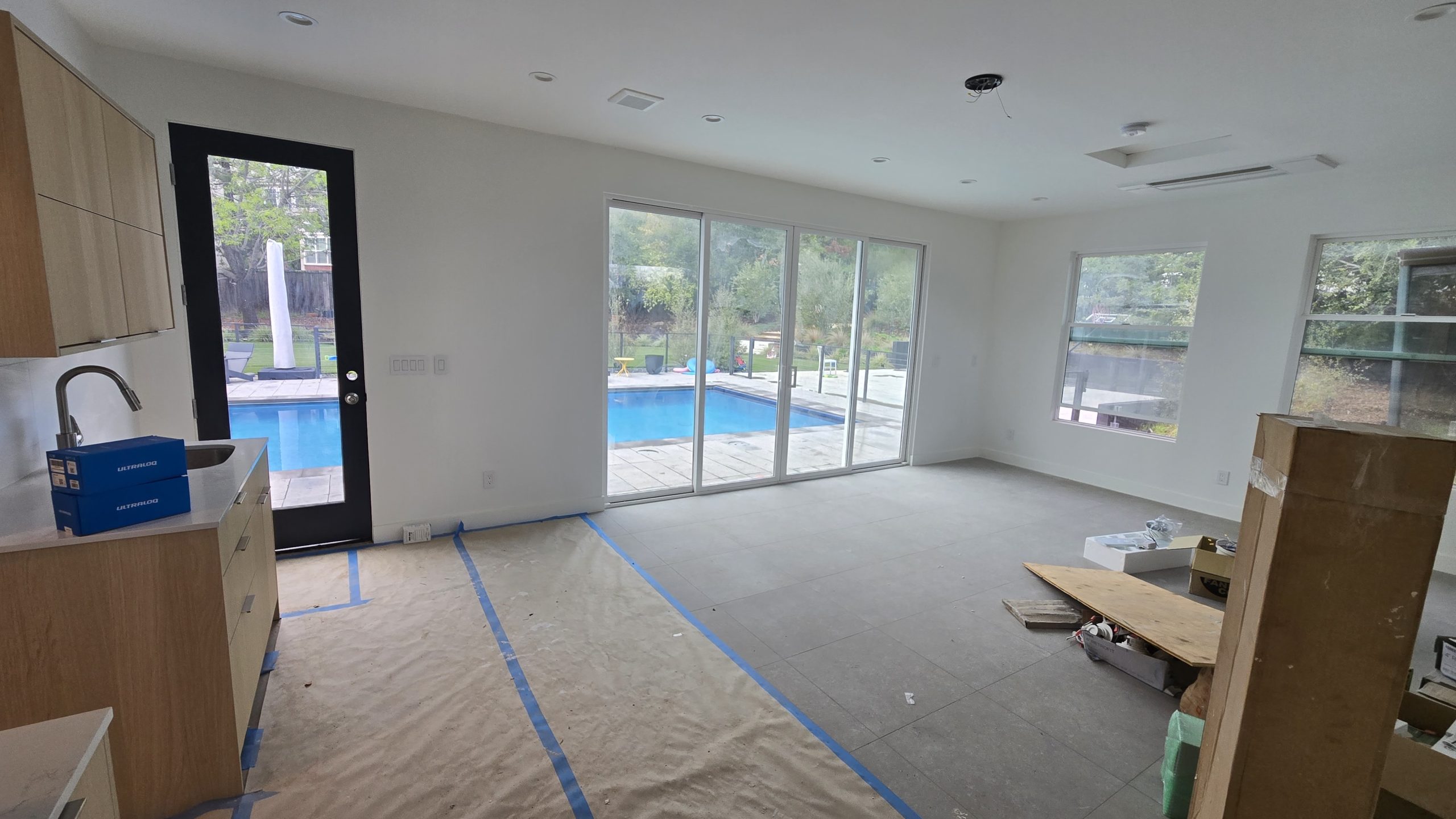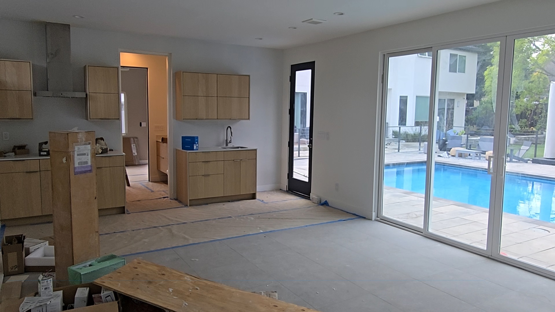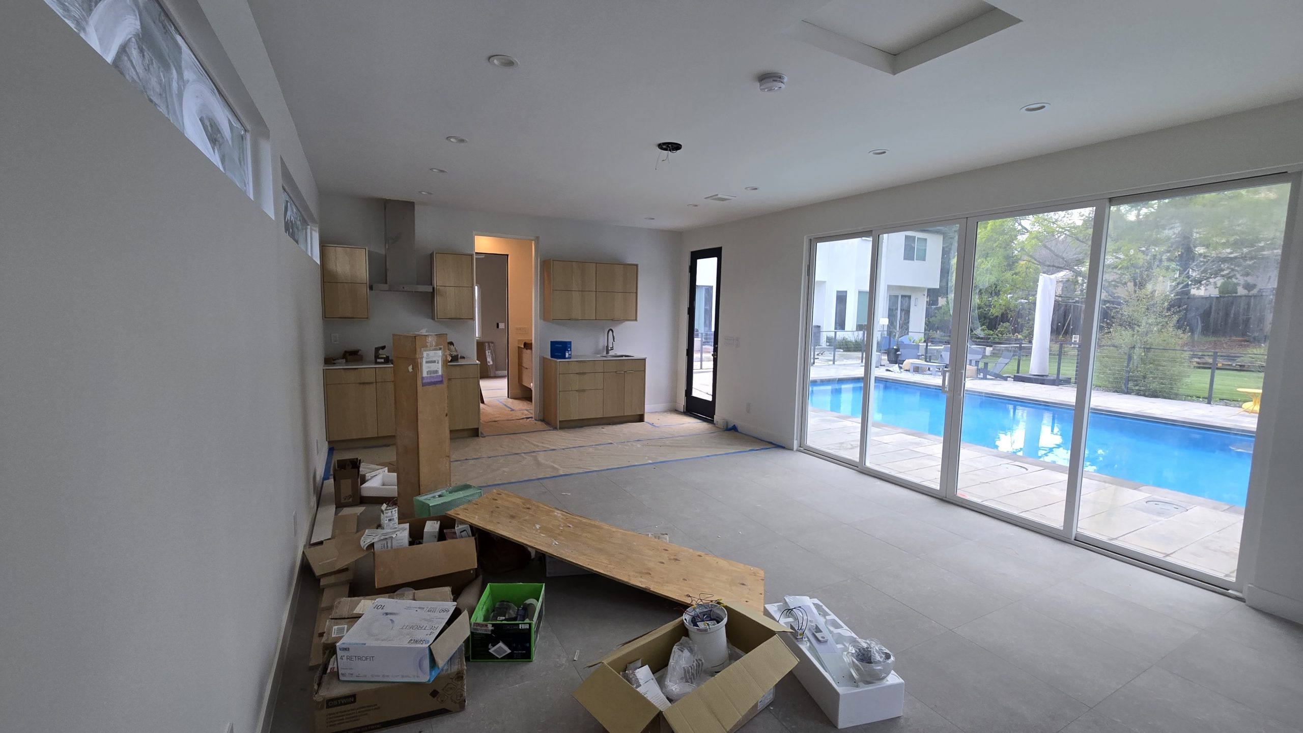 Panoramic View of Living and Kitchen Area with Construction Supplies