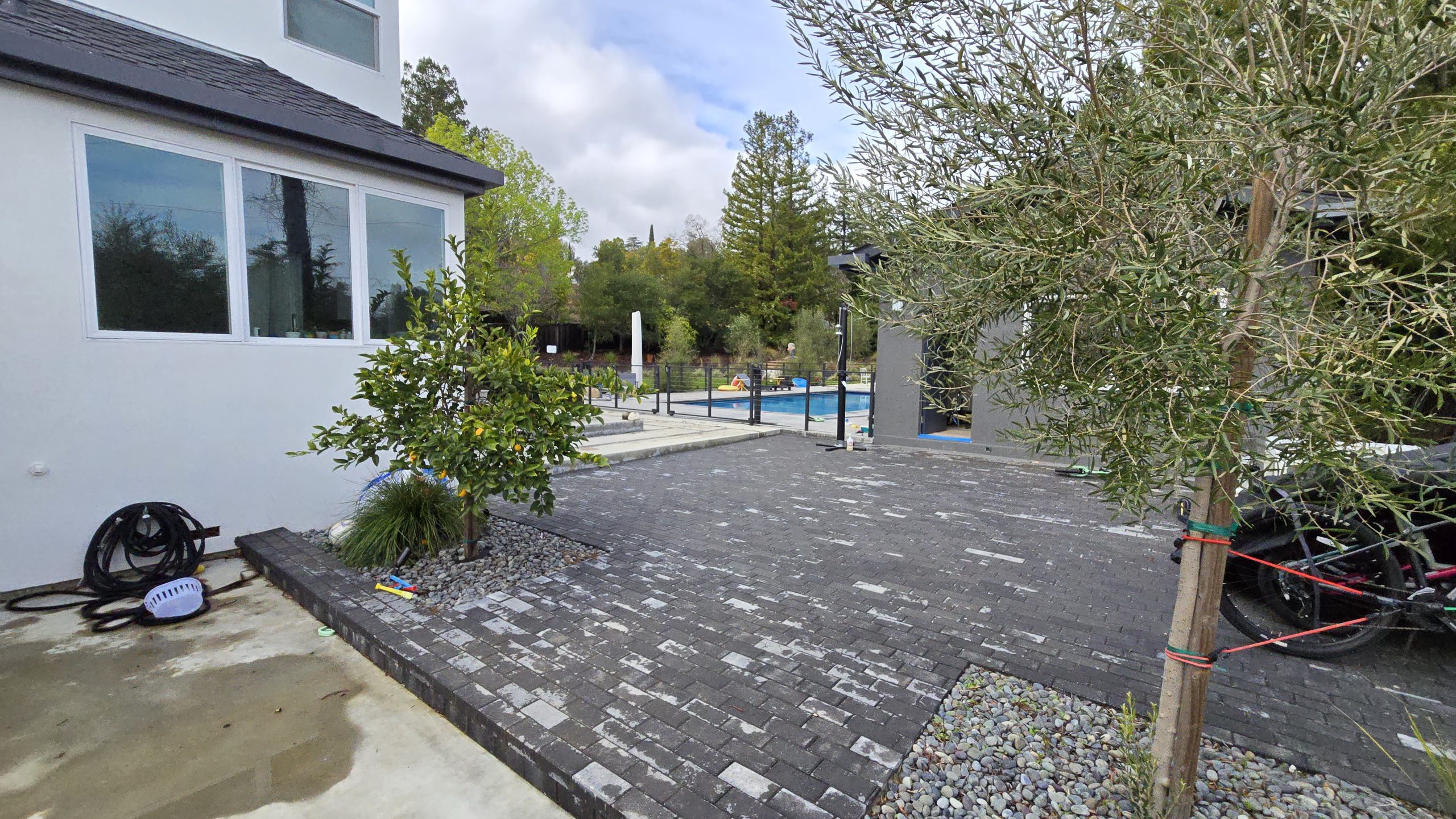 Front Yard View Showing Paved Walkway, Landscaping, and Pool Area