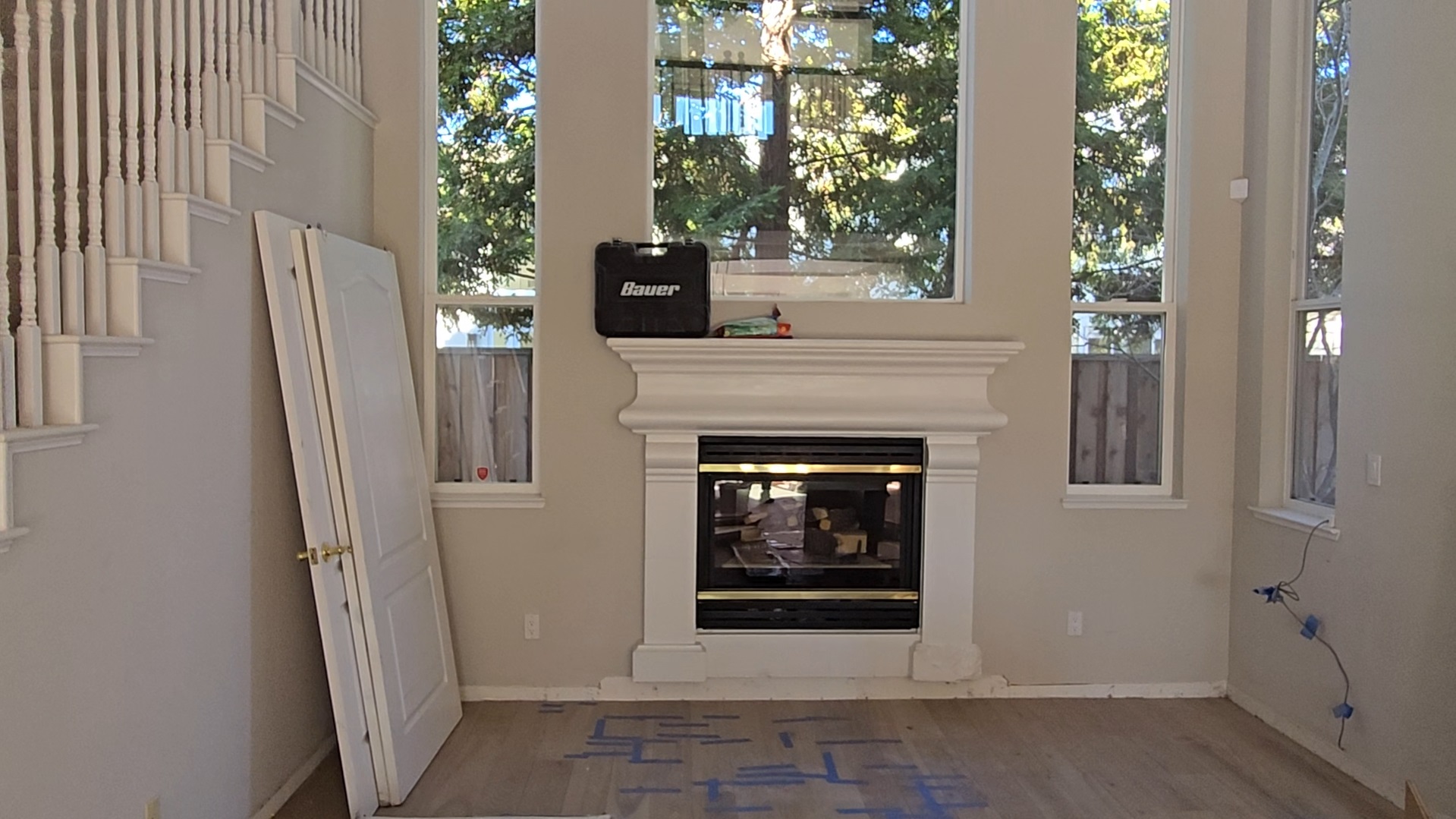 9Builders: Elegant Staircase and Open Living Room with Fireplace