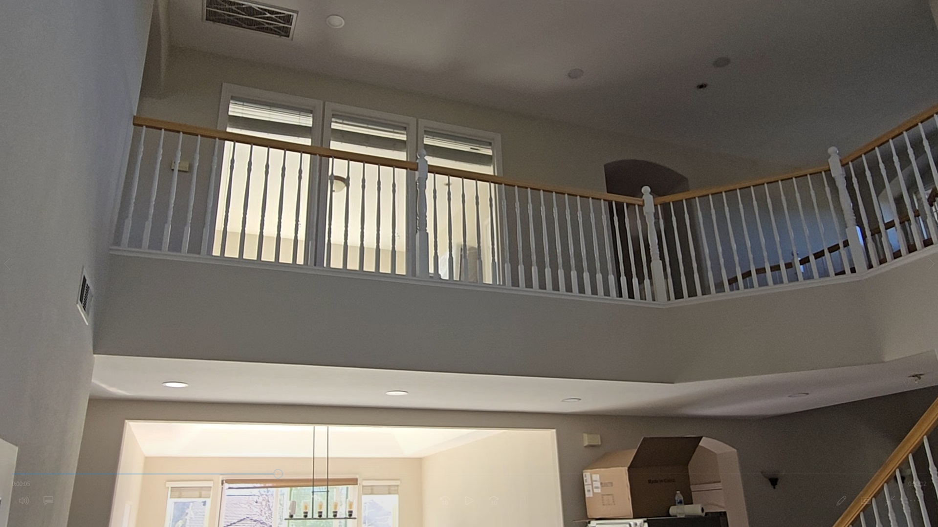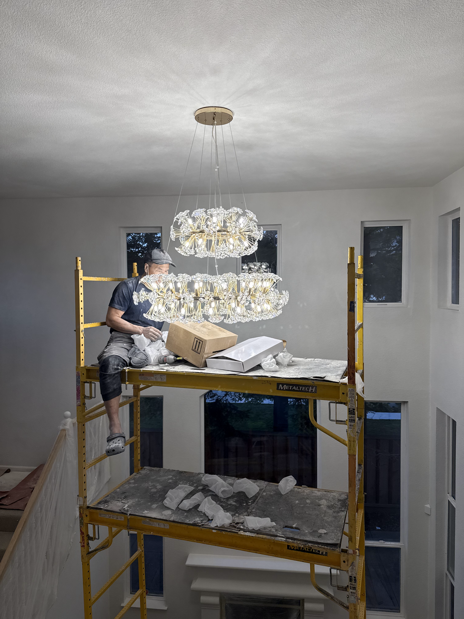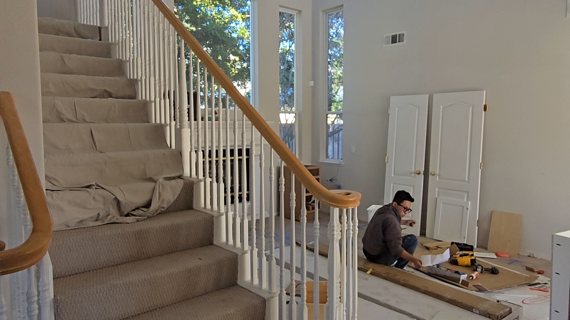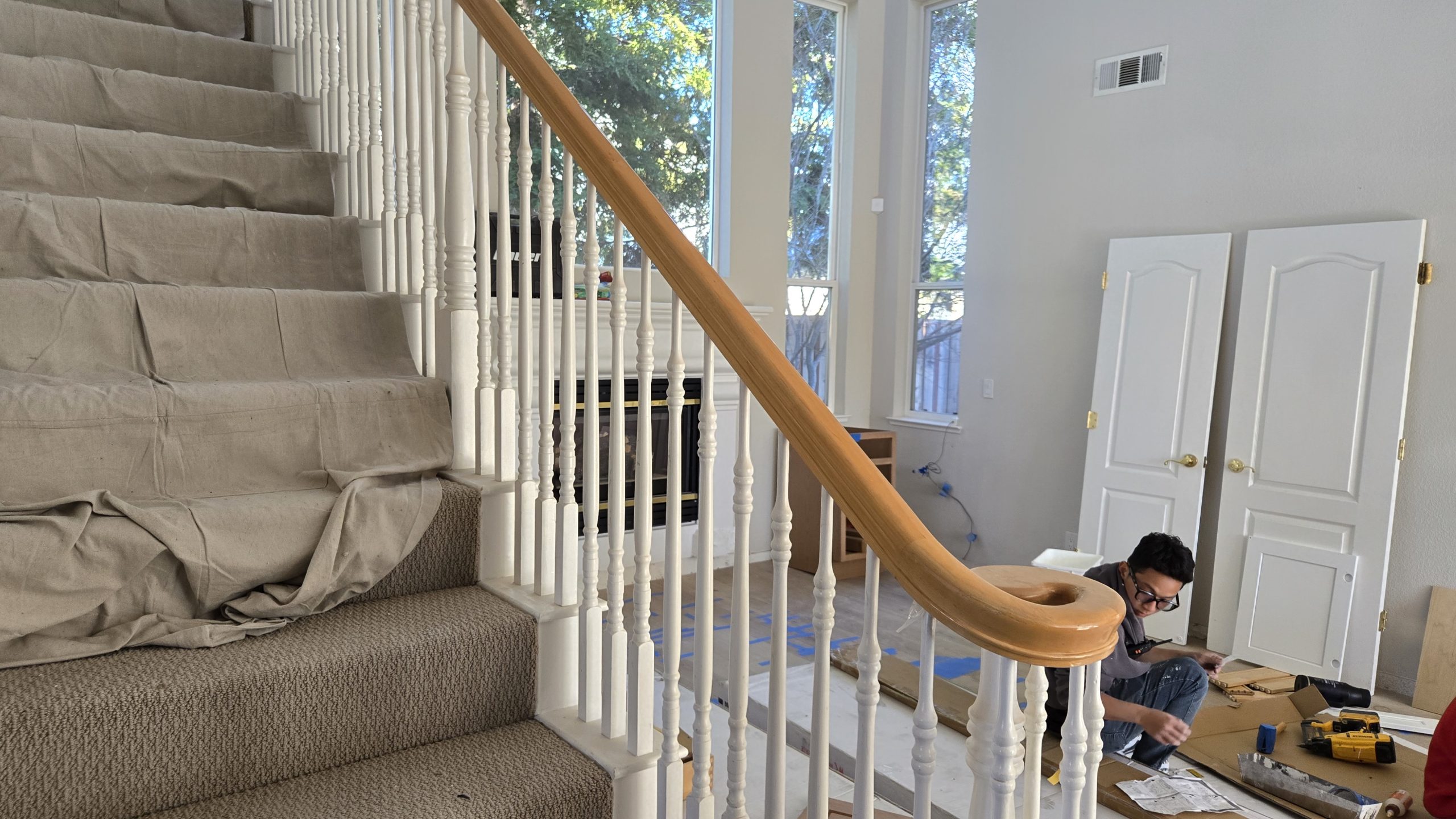 9Builders: Elegant Staircase and Custom Lighting in a Bright Entryway