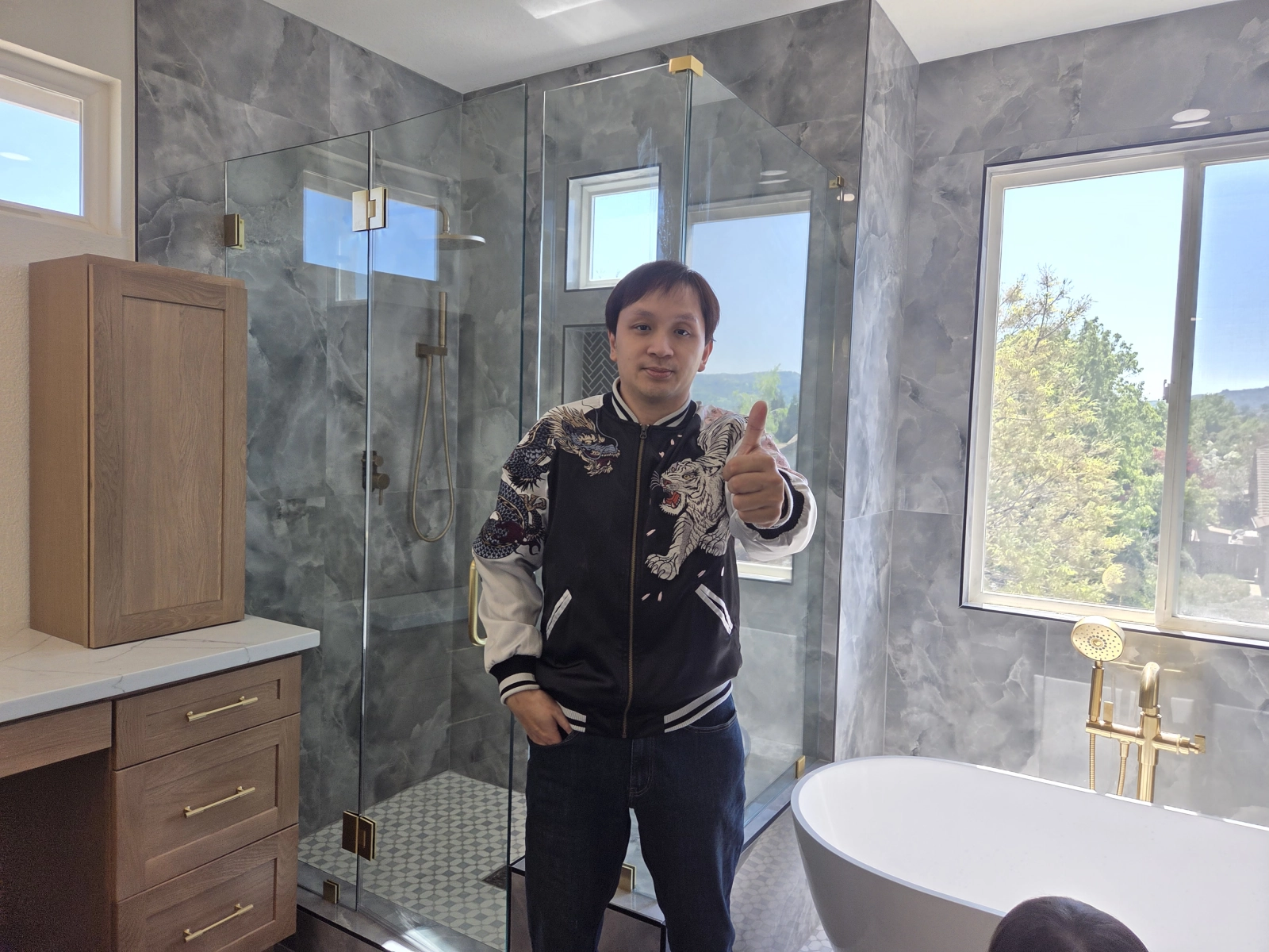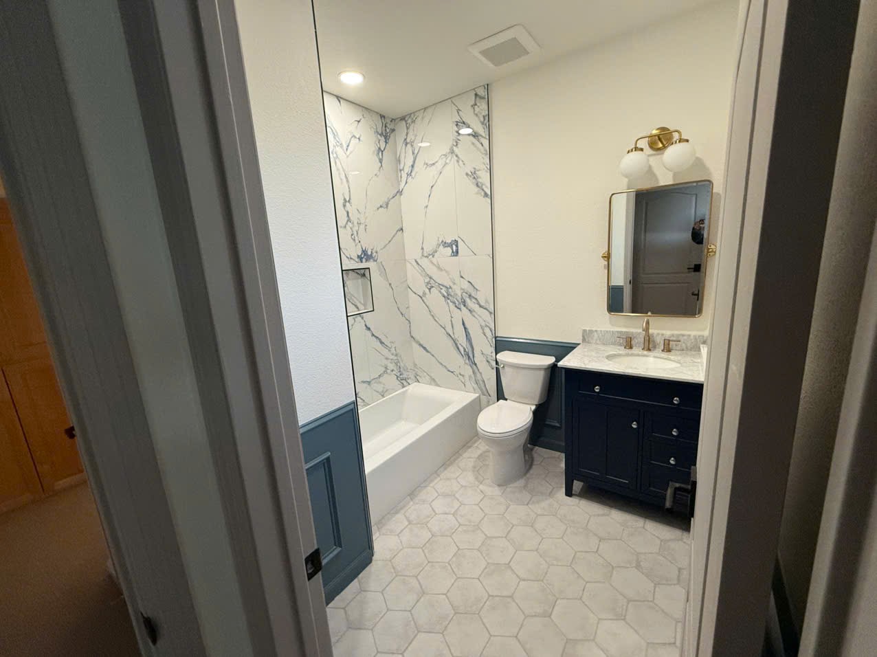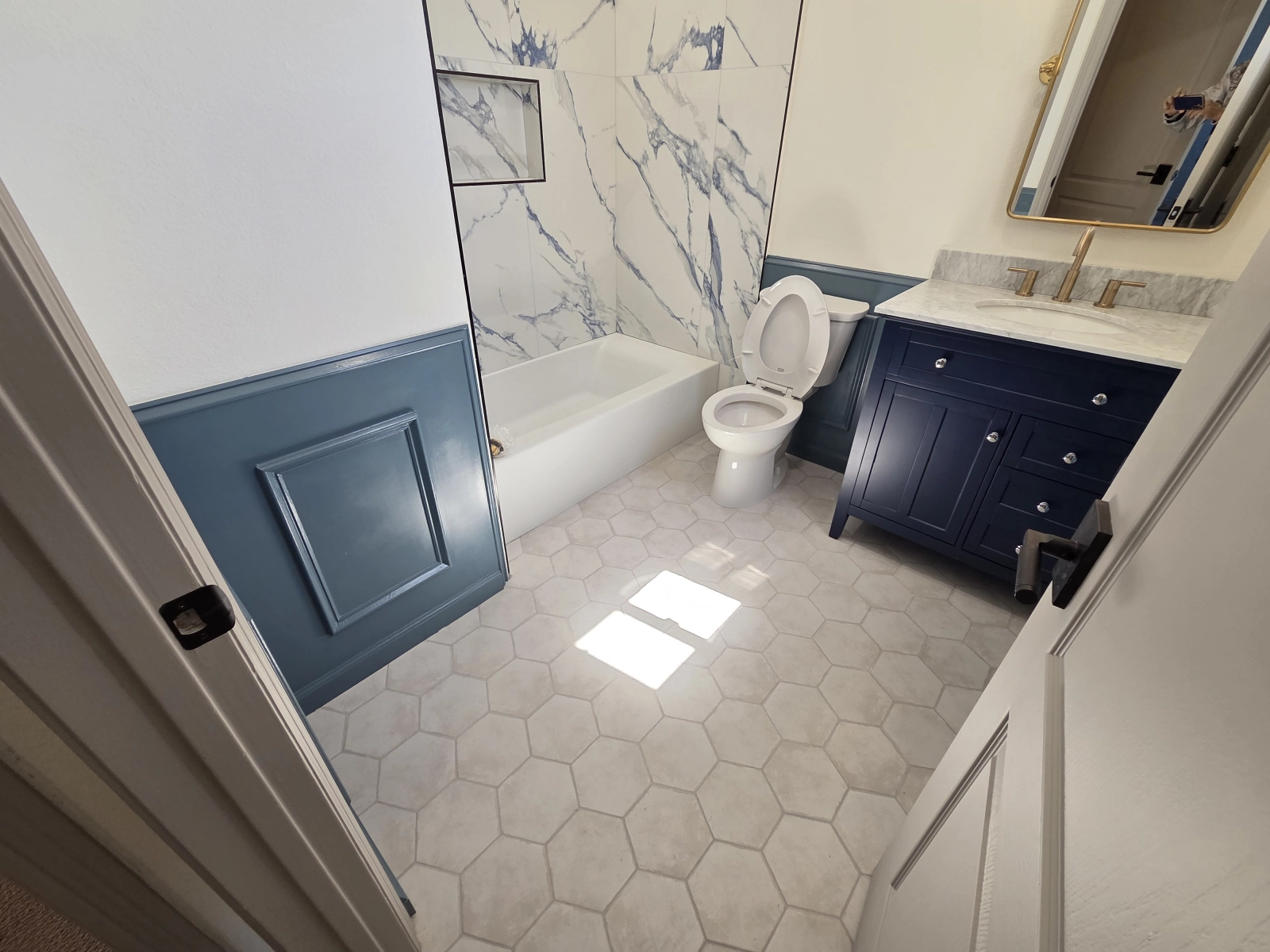 9Builders: High-End Bathroom Remodel Featuring Custom Cabinets and Marble